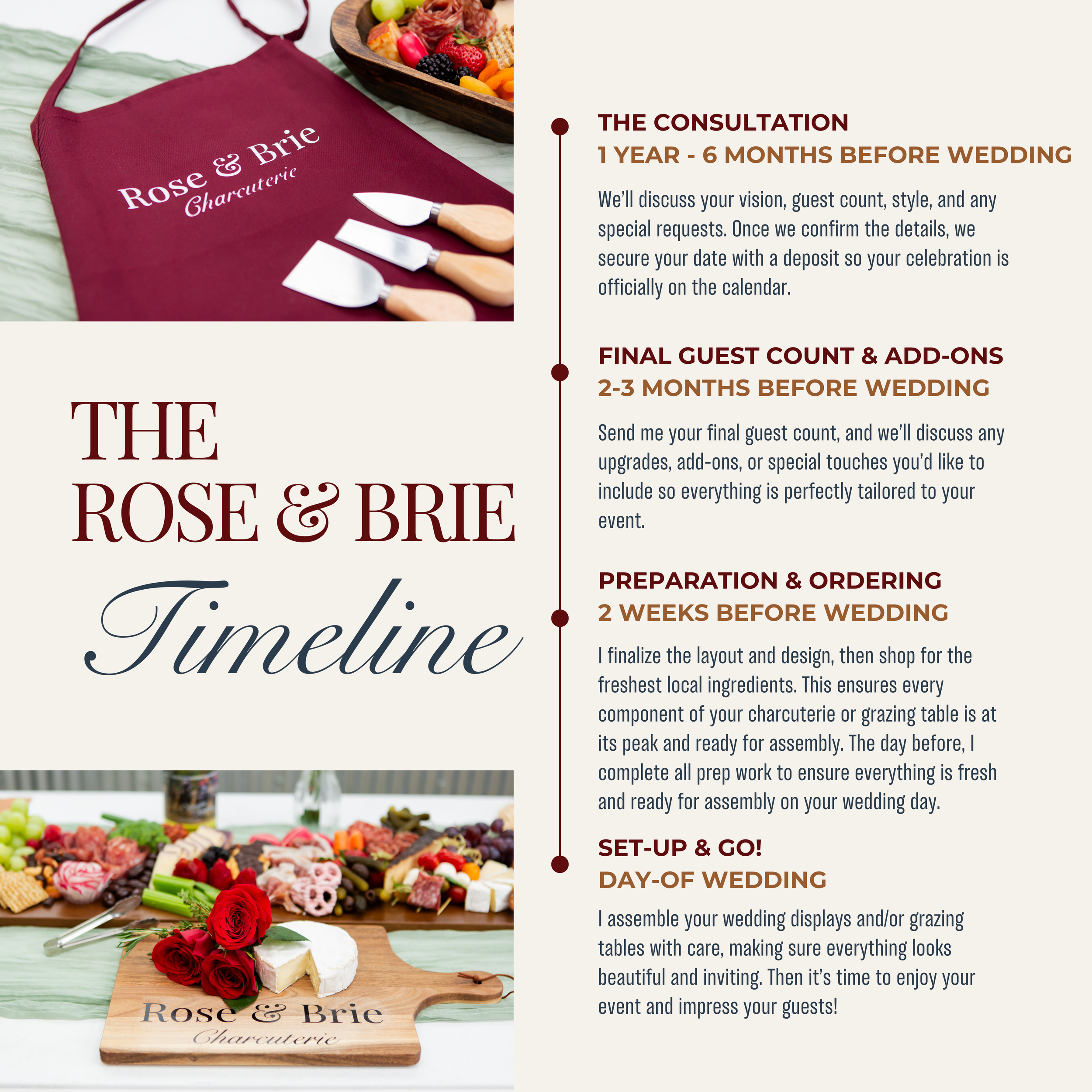 At Rose & Brie, we create beautifully styled charcuterie boards and grazing tables that bring people together. From intimate bridal brunches to full reception spreads, every display is thoughtfully curated with fresh ingredients, seasonal touches, and artistic presentation — tailored to your colors, theme, and guest needs. As a local woman-owned business, we take pride in making your event feel warm, inviting, and unforgettable